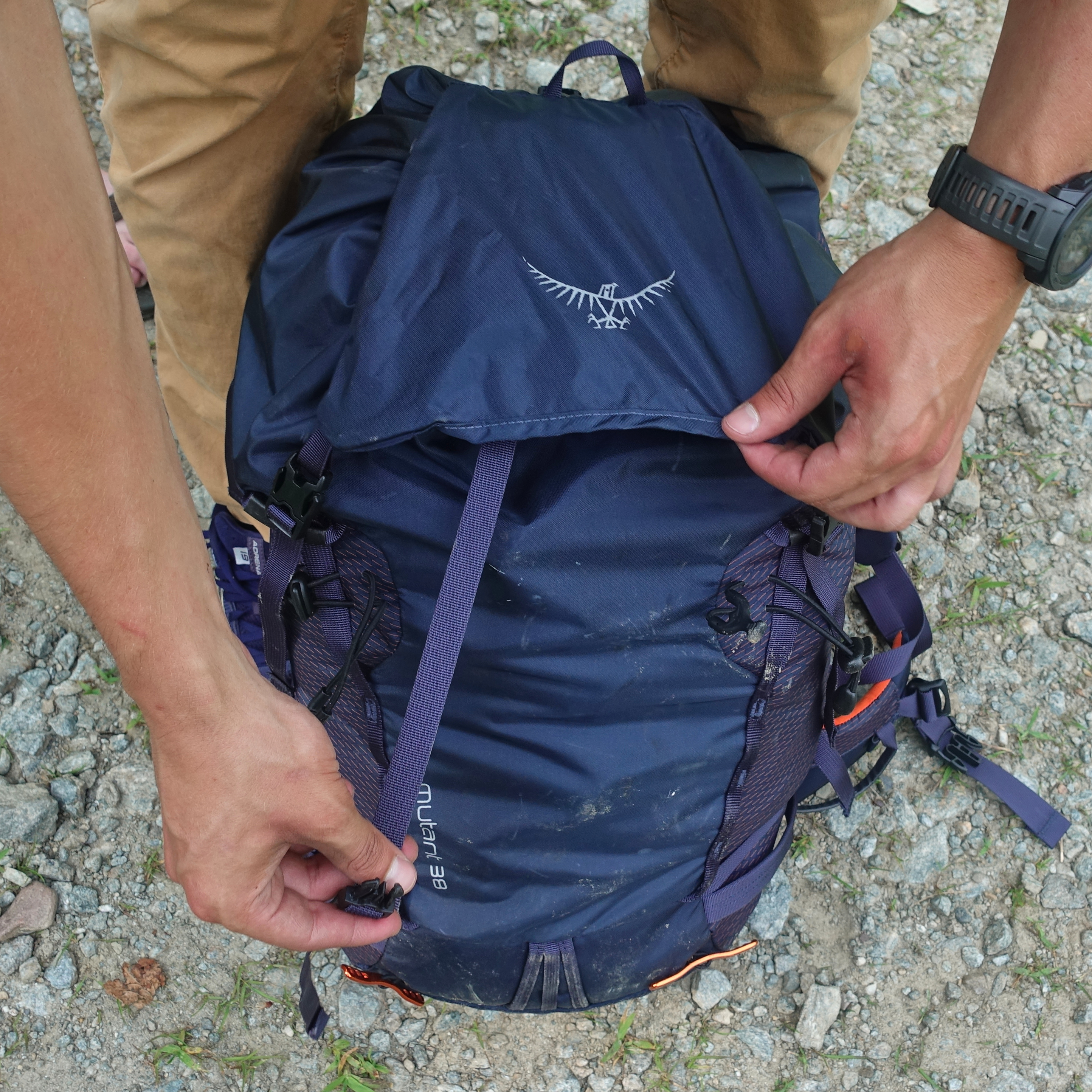 The Black Diamond Speed 40 can have its lid removed but that leaves a small drawstring opening exposed upwards that can allow dirt, snow and water to get in. The Mutant 38 fixes this problem with the internal flapjacket, which folds out and clips to the straps that the lid would if it was still attacked. This keeps gear clean and dry even with the lid removed.